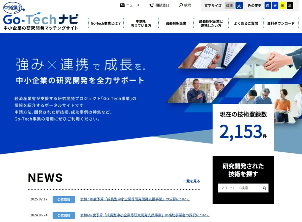 申請に必要な情報や事業化の好事例、全国の事業管理機関・研究機関の検索などは、Go-Techナビ(中小企業庁の研究開発マッチングサイト)で確認できます。